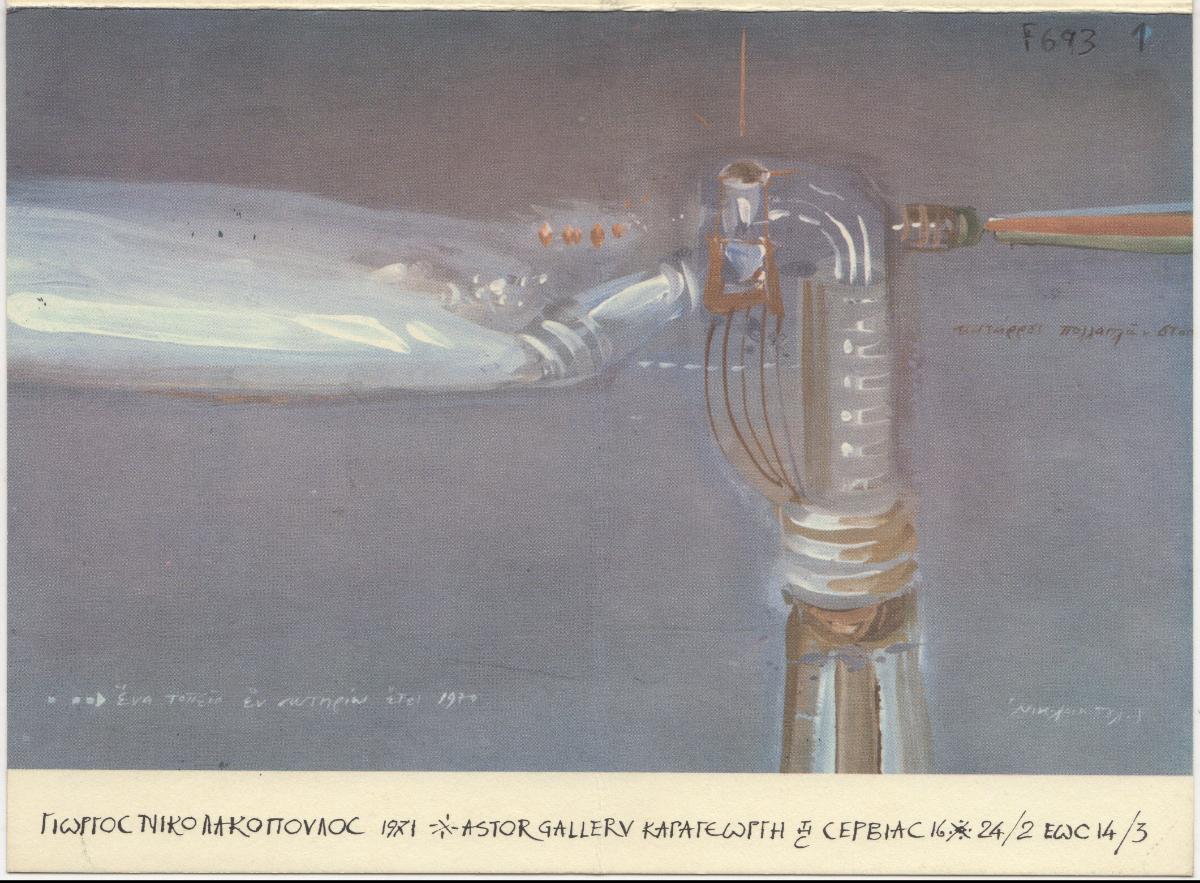 Έντυπο της ατομικής έκθεσης του Γιώργου Νικολακόπουλου στην Γκαλερί “Άστορ” στην Αθήνα. Περιέχει κείμενο του καλλιτέχνη και εικονογράφηση.