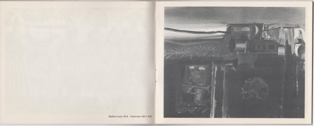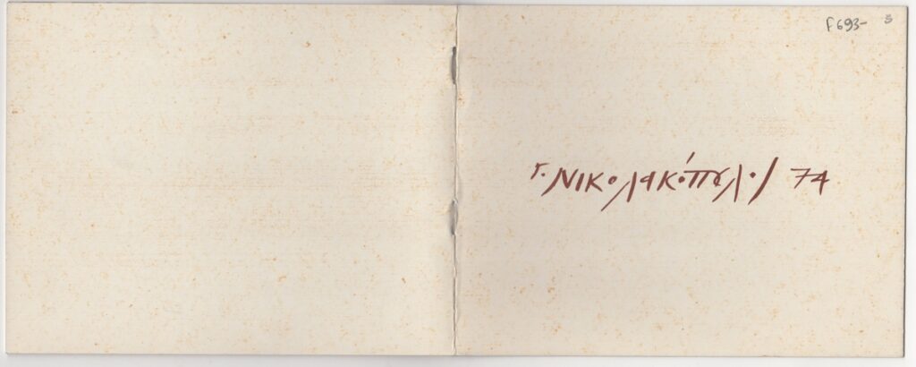 Κατάλογος, χαρτί, 8 φφ, 15×19 εκ., στα ελληνικά, έκθεσης ζωγραφικής του Γιώργου Νικολακόπουλου. Περιέχει κείμενο του Νίκου Χουλιαρά για τον καλλιτέχνη και το έργο του με τίτλο “Η ζωγραφική εορτή του Γιώργου Νικολακόπουλου”, βιογραφικό σημείωμα και εικονογράφηση.
