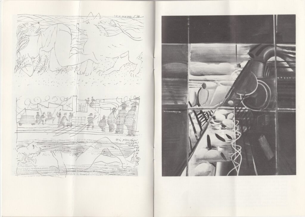 Έντυπο, χαρτόνι, 24,5×17 εκ., 4 φφ, στα ελληνικά, ατομικής έκθεσης του Γιώργου Νικολακόπουλου. Περιέχει κείμενο του καλλιτέχνη, βιογραφικό σημείωμα και εικονογράφηση.