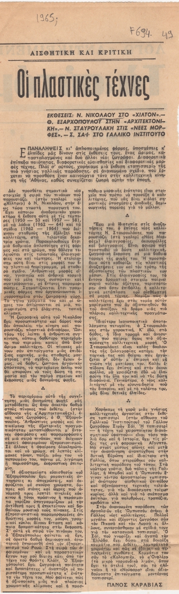 Απόκομμα, χαρτί, 34×11,5 εκ., στα ελληνικά, δημοσίευσης κριτικής για τις τρέχουσες εκθέσεις της περιόδου. Ειδικότερα σχολιάζεται το έργο που παρουσιάζει ο Νικόλαος Νικολάου, σε ατομική του έκθεση στην Αίθουσα Τέχνης Αθηνών Χίλτον, του Θανάση Εξαρχόπουλου στην Αίθουσα Αρχιτεκτονικής. Ακόμη, η ατομική έκθεση του Νίκου Σταυρουλάκη στην γκαλερί Νέες Μορφές και η έκθεση ταπισερί του Σιμόν Σάϊ στο Γαλλικό Ινστιτούτο Αθηνών. Εντάσσεται στη στήλη του εντύπου “Αισθητική και Κριτική”.