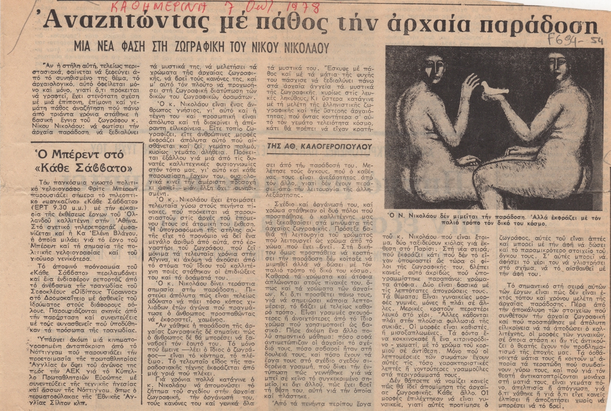 Απόκομμα, χαρτί, 18×27 εκ., στα ελληνικά, δημοσίευσης άρθρου αναφερόμενου στην καλλιτεχνική δραστηριότητα του Νικόλαου Νικολάου.