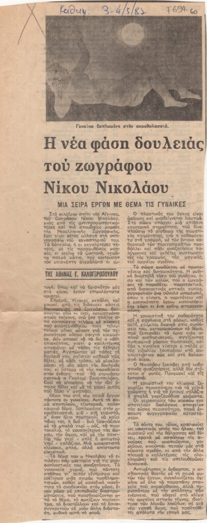 Απόκομμα, χαρτί, 31,5×13 εκ., στα ελληνικά, δημοσίευσης άρθρου αναφερόμενου στον Νικόλαο Νικολάου. Σχολιάζονται οι νέες φιγούρες γυναικών που φιλοτεχνεί.