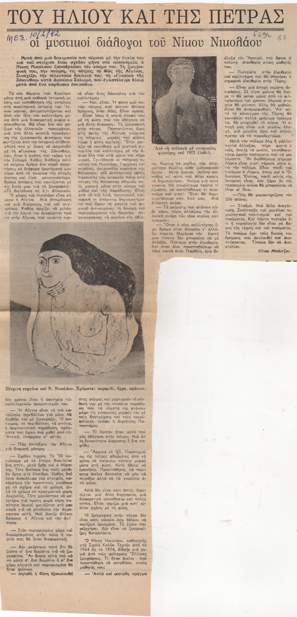 Απόκομμα, χαρτί, 43×20,5 εκ., στα ελληνικά, δημοσίευσης συνέντευξης του Νικόλαου Νικολάου στην Κίτσα Μπόντζου. Ο καλλιτέχνης μιλά για τις φιγούρες γυναικών που δημιούργησε, με τις οποίες επιστρέφει στην καλλιτεχνική δραστηριότητα. Αναλύει την άποψή του για τη νεοελληνική τέχνη και εξηγεί τους λόγους για τους οποίους επέλεξε να μείνει στην Αίγινα.
