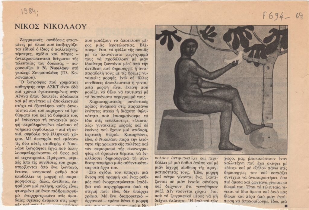 Απόκομμα, χαρτί, 14×21 εκ., στα ελληνικά, δημοσίευσης κριτικής έκθεσης του Νικόλαου Νικολάου, η οποία διεξάγεται στην γκαλερί Ζουμπουλάκη στην Αθήνα. Δίνονται βιογραφικά και σχολιάζεται η τεχνοτροπία του.
