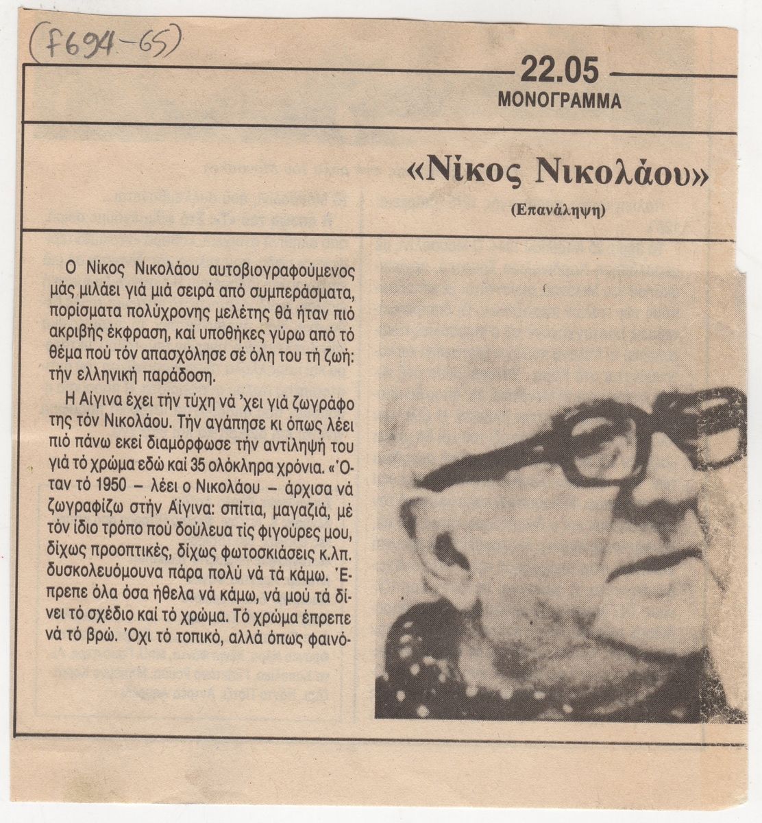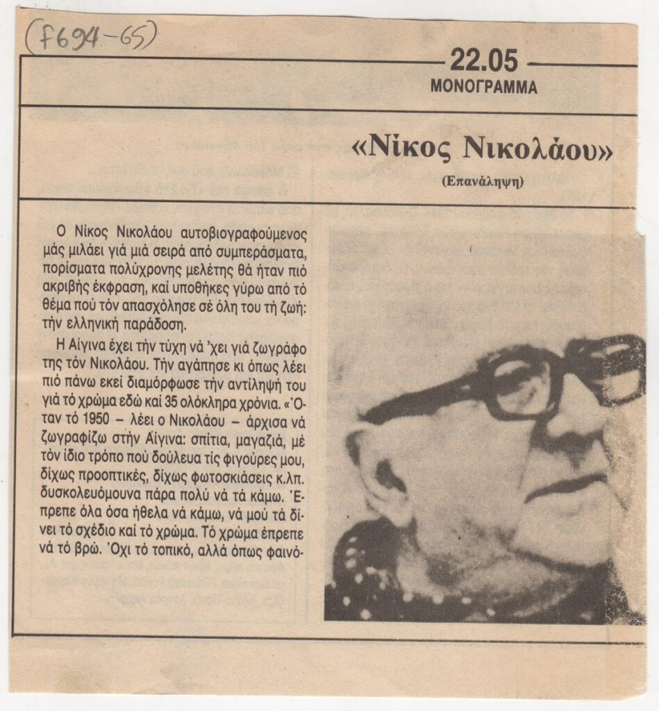 Απόκομμα, χαρτί, 2 φφ, 14×13 και 13×7,5 εκ., στα ελληνικά, δημοσίευσης άρθρου αναφερόμενου σε εκπομπή για τον Νικόλαο Νικολάου. Σχολιάζεται η διαμονή του καλλιτέχνη στην Κέρκυρα και δίνεται απόσπασμα κριτικής του Οδυσσέα Ελύτη για το έργο του.