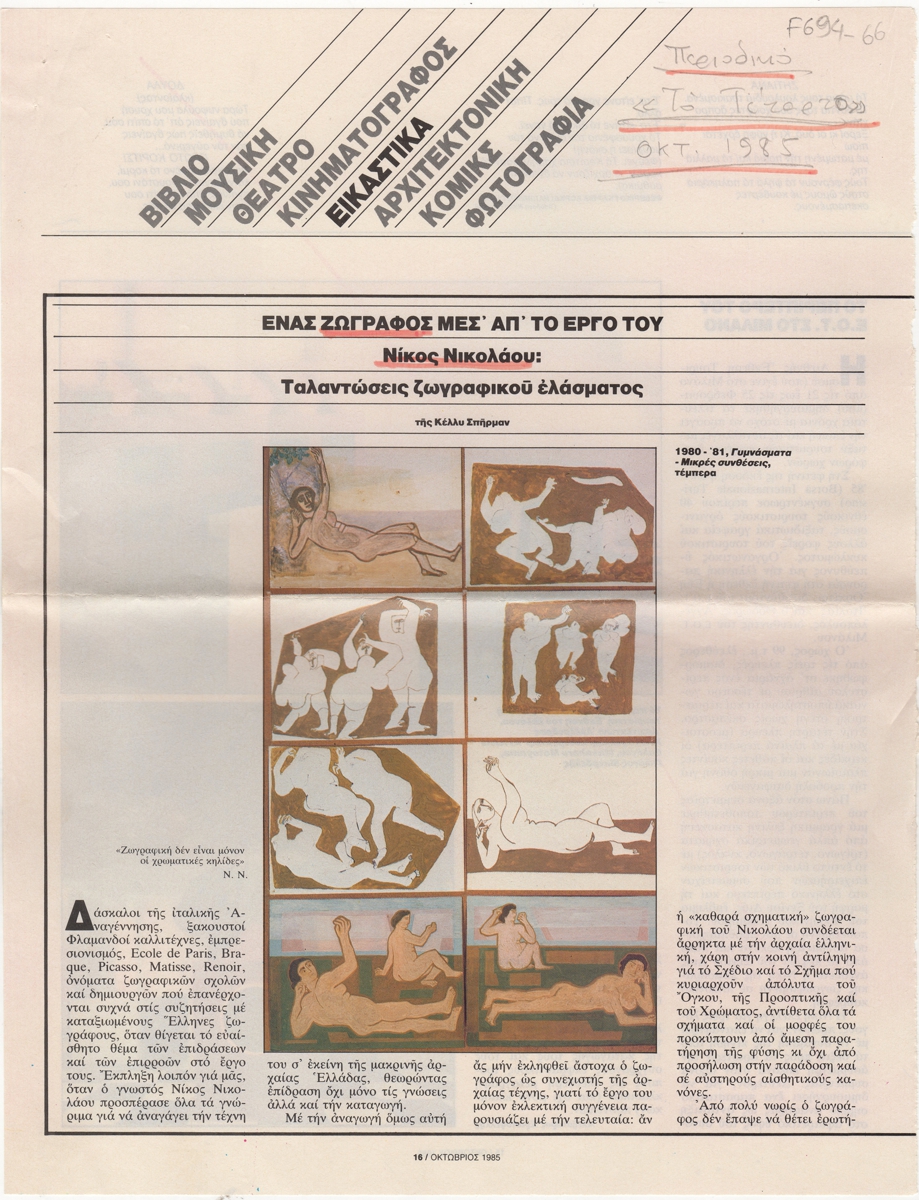Απόκομμα, χαρτί ιλλουστρασιόν, 2 φφ, 30×23 εκ., στα ελληνικά, δημοσίευσης άρθρου αναφερόμενου στο εικαστικό έργο του Νικόλαου Νικολάου.
