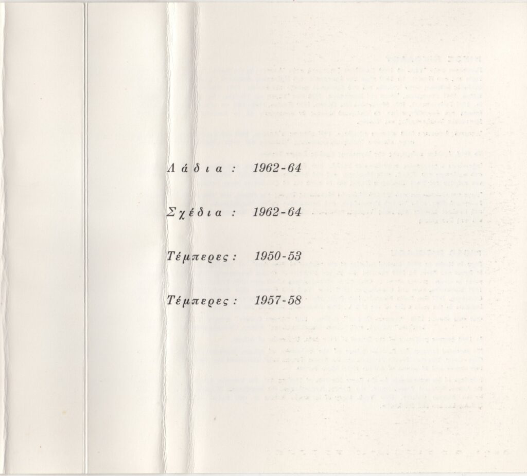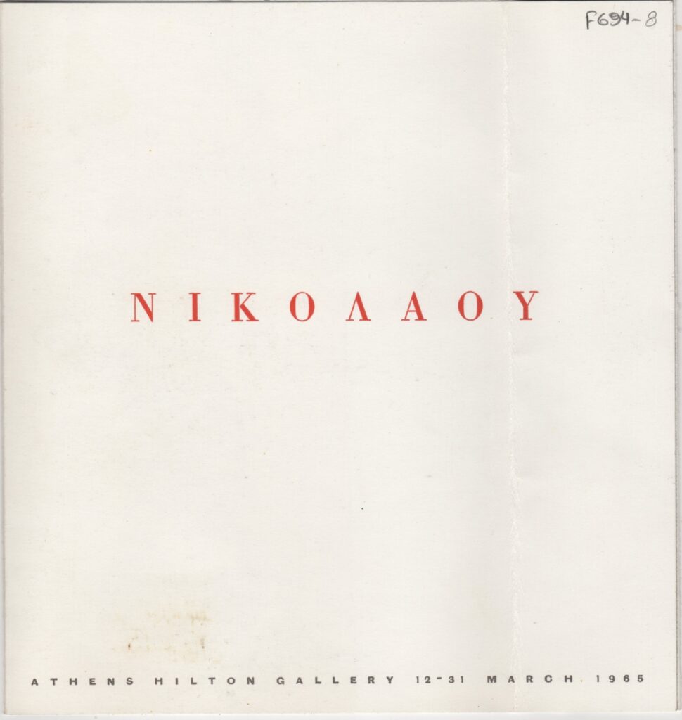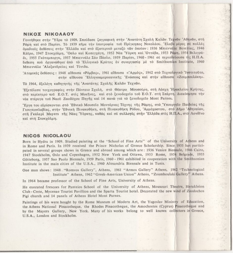 Έντυπο, χαρτόνι δίπτυχο, 21×20 εκ., στα ελληνικά και αγγλικά, έκθεσης του Νίκου (Νικόλαου) Νικολάου. Περιέχει βιογραφικό σημείωμα και εικονογράφηση.