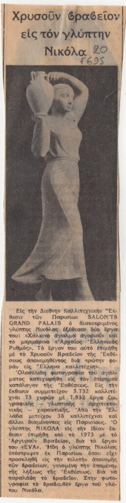 Απόκομμα, χαρτί, 21×5,5 εκ., στα ελληνικά, δημοσίευσης άρθρου το οποίο αναφέρεται στη βράβευση του γλύπτη Νικόλα, με το χρυσό βραβείο στο Salon 75 στο Παρίσι για τα έργα του “Αρχαίος Ελληνικός Ρυθμός” και “Χάλκινο άγαλμα αγοριού”.