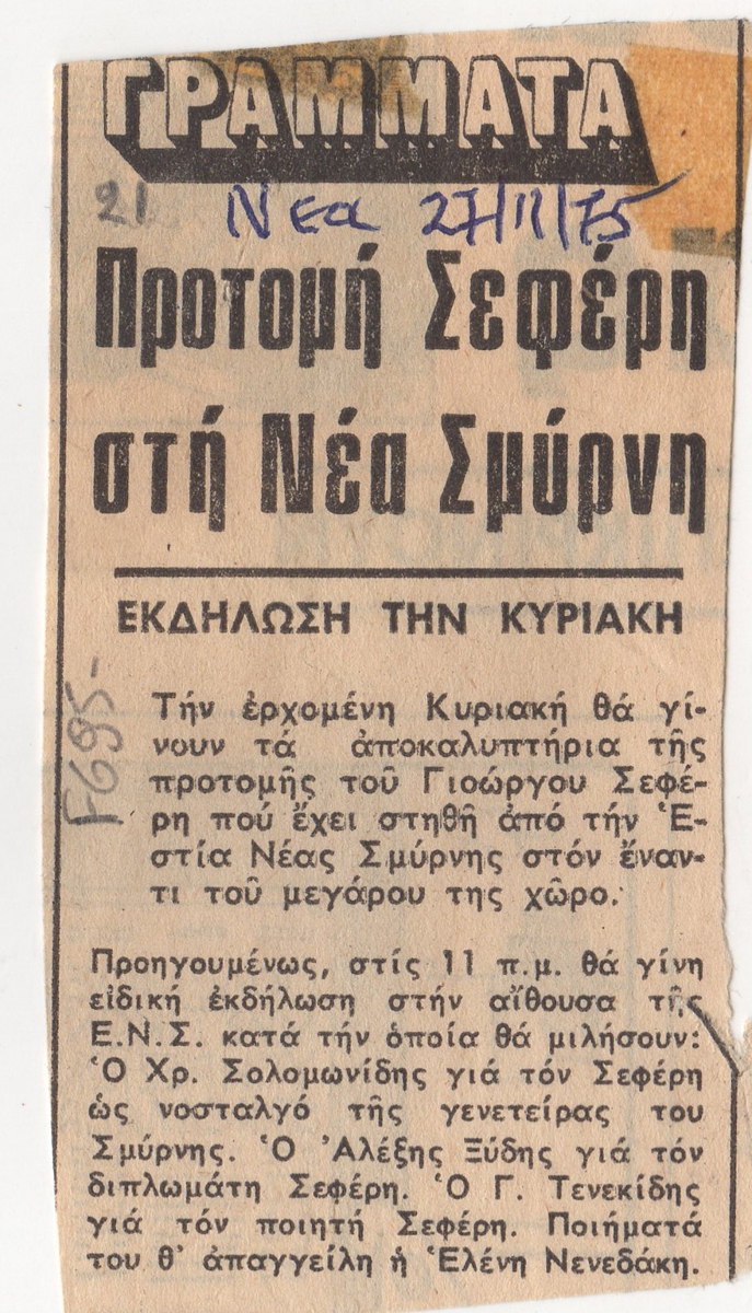 Απόκομμα, χαρτί, 9,5×5 εκ., στα ελληνικά, δημοσίευσης άρθρου το οποίο αναφέρεται στα αποκαλυπτήρια προτομής του Γιώργου Σεφέρη, στη Νέα Σμύρνη στην Αθήνα. Σημειώνονται οι ομιλητές που θα πλαισιώσουν την εκδήλωση: Χρήστος Σολομωνίδης, Αλέξης Ξύδης, Γιώργος Τενεκίδης, Ελένη Νενεδάκη.