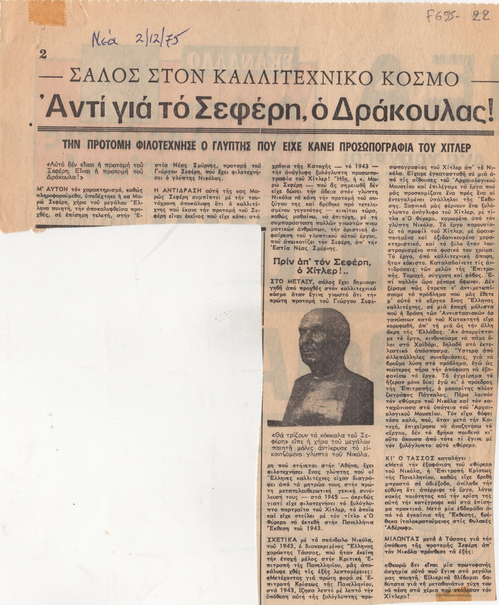 Απόκομμα, χαρτί ακανόνιστου μεγέθους, στα ελληνικά, δημοσίευσης άρθρου το οποίο αναφέρεται στα διφορούμενα και κυρίως αρνητικά σχόλια που έλαβε προτομή του Γιώργου Σεφέρη που φιλοτέχνησε ο γλύτπης Νικόλας. Ακόμη, σχολιάζεται προηγούμενη προτομή του καλλιτέχνη με εικονιζόμενο τον Αδόλφο Χίτλερ.