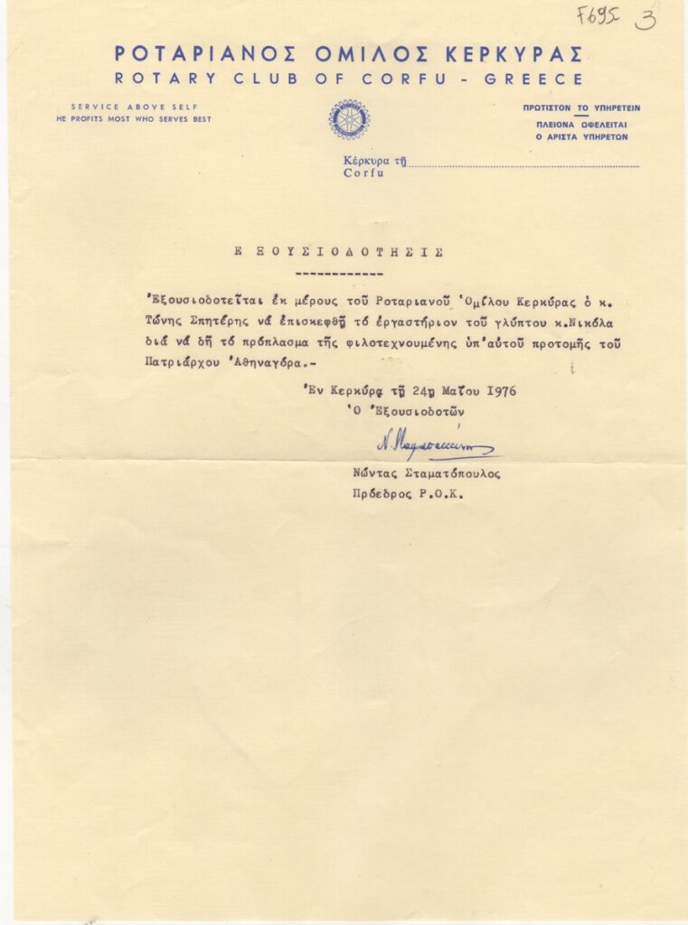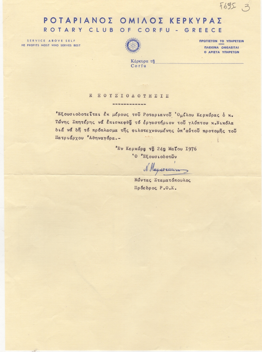 Επιστολή- εξουσιοδότηση, δακτυλόγραφο, χαρτί, 28,5×21 εκ., στα ελληνικά, απεσταλμένη από τον πρόεδρο του Ροταριανού Ομίλου Κέρκυρας Νώντα Σταματόπουλο, προς τον Τώνη Σπητέρη. Ο τεχνοκριτικός εξουσιοδοτείται να επισκεφτεί εκ μέρους του Ομίλου το εργαστήριο του γλύπτη Νικόλα προκειμένου να δει το πρόπλασμα που δημιούργησε ο καλλιτέχνης με εικονιζόμενο τον Πατριάρχη Αθηναγόρα.