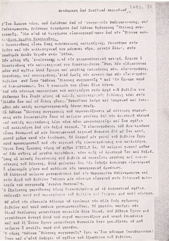 Φωτοαντίγραφο δακτυλόγραφου κειμένου, χαρτί, 30×21 εκ., στα ελληνικά, που αποτελεί μετάφραση άρθρου εντύπου της Σουηδίας αναφερόμενου στον Μιχάλη Νικολινάκο. Σχολιάζεται η κυκλοφορία τόμου διηγημάτων Ελλήνων συγγραφέων, που εικονογράφησε ο καλλιτέχνης.