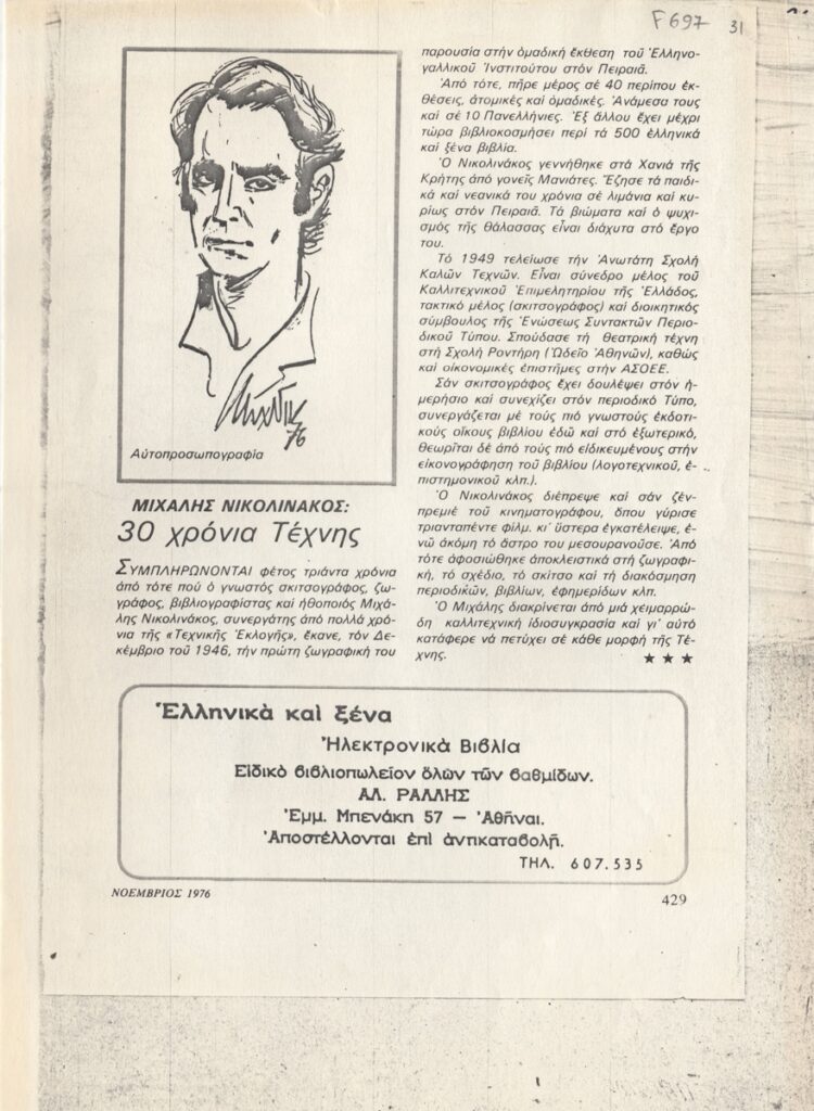 Φωτοαντίγραφο, χαρτί, 29,5×21 εκ., στα ελληνικά, δημοσίευσης άρθρου αναφερόμενου στον Μιχάλη Νικολινάκο, με αφορμή τη συμπλήρωση 30 χρόνων παρουσίας του στα καλλιτεχνικά δρώμενα.