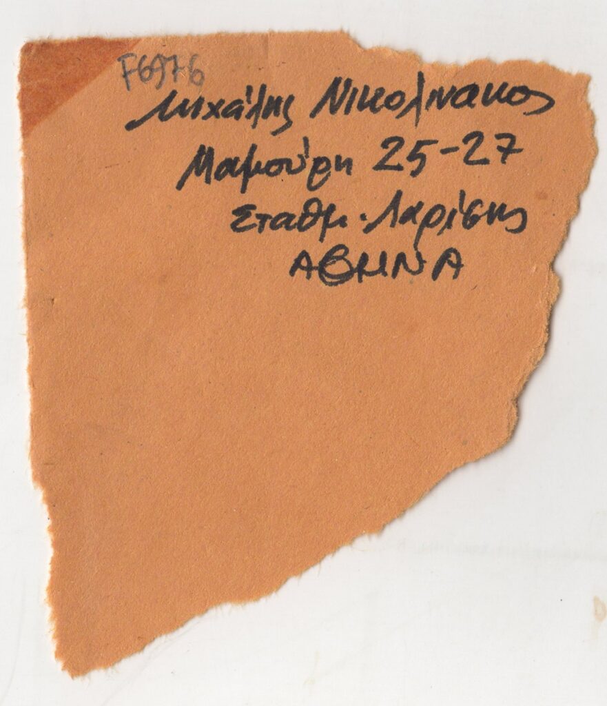 Απόκομμα φακέλου, χειρόγραφο, χαρτί ακανόνιστου μεγέθους, στα ελληνικά, με επιγραφή που φέρει τη διεύθυνση του Μιχάλη Νικολινάκου στην Αθήνα.