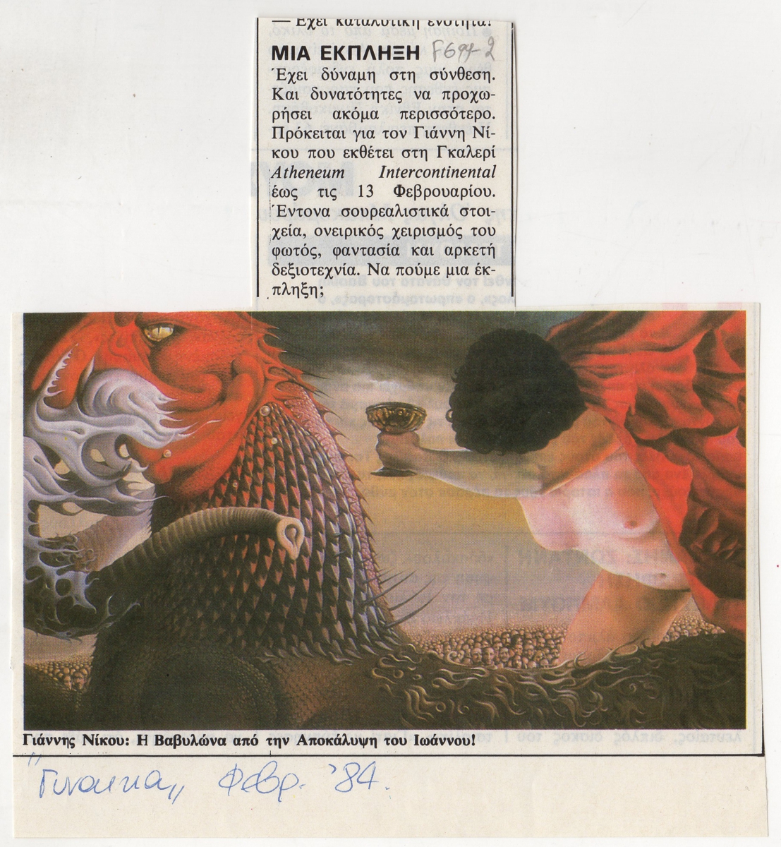 Απόκομμα, χαρτί ακανόνιστου μεγέθους, στα ελληνικά, δημοσίευσης κριτικής ατομικής έκθεσης του Γιάννη Νίκου στην Athenaeum Gallery στην Αθήνα.