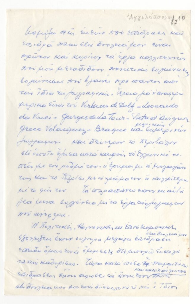 Κείμενο, χειρόγραφο, με μπλε μελάνι, στα ελληνικά, σε χαρτί, 20,9×13,5 εκ., μία όψη. Απόσπασμα κειμένου του Μένη Αγγελόπουλου για το έργο του. Πάνω δεξιά, επιγραφή.