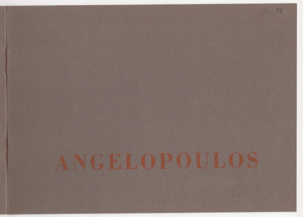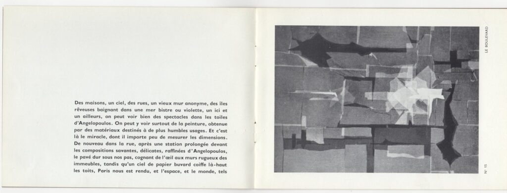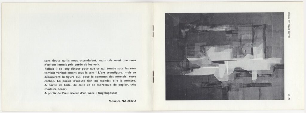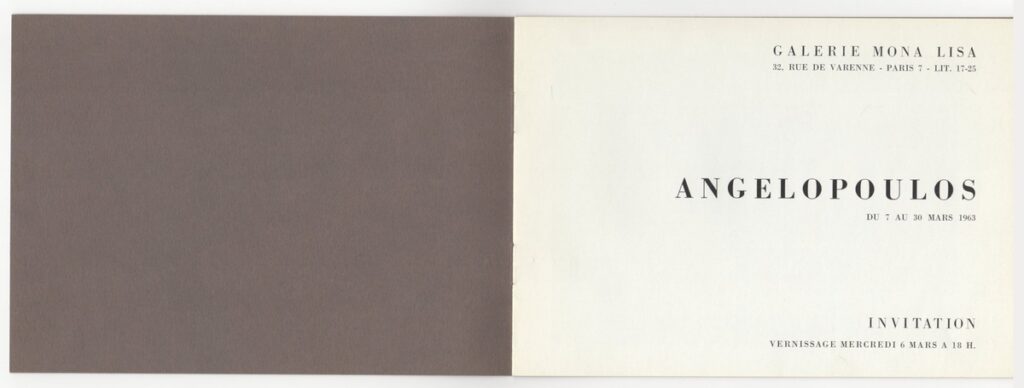 Έντυπο, ιλουστρασιόν χαρτί και χαρτόνι στο εξώφυλλο, 6 φφ, στα γαλλικά, 15,0×21,0 εκ. Έντυπο της ατομικής έκθεσης ζωγραφικής του Μένη Αγγελόπουλου στο Παρίσι το 1963. Περιέχει κείμενο του M. Nadeau, κατάλογο έργων και σύντομο βιογραφικό σημείωμα του καλλιτέχνη. Εσωτερικά εικονογράφηση.