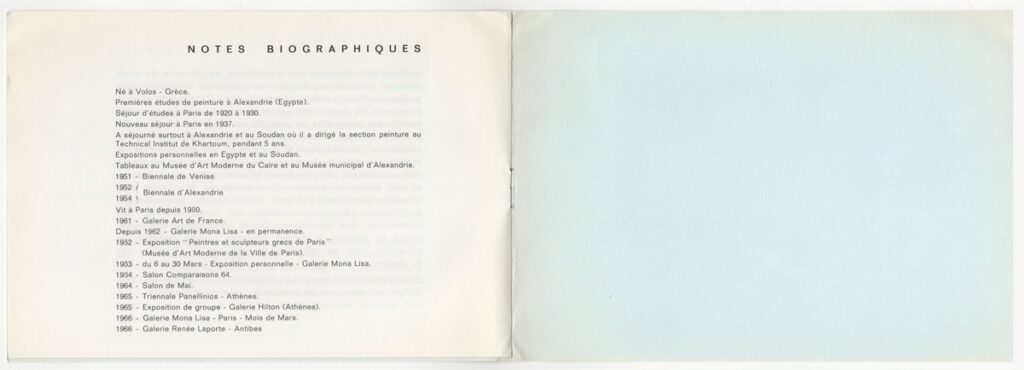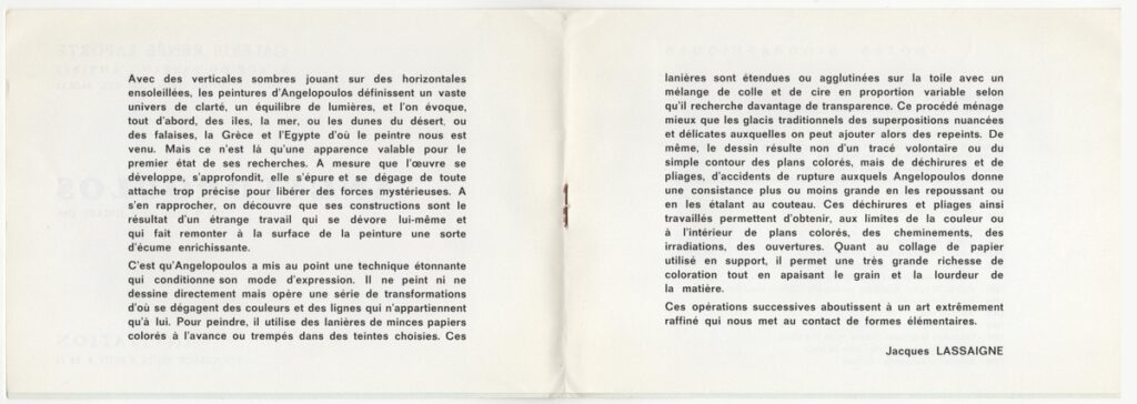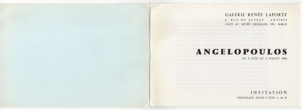 Έντυπο, στα γαλλικά, ιλουστρασιόν χαρτί και χαρτόνι στο εξώφυλλο, 4 φφ, 15,5×21,0 εκ.. Κατάλογος της ατομικής έκθεσης ζωγραφικής του Μένη Αγγελόπουλου στην Antibes το 1966. Περιέχει κείμενο του Jacques Lassaigne και σύντομο βιογραφικό σημείωμα του καλλιτέχνη.