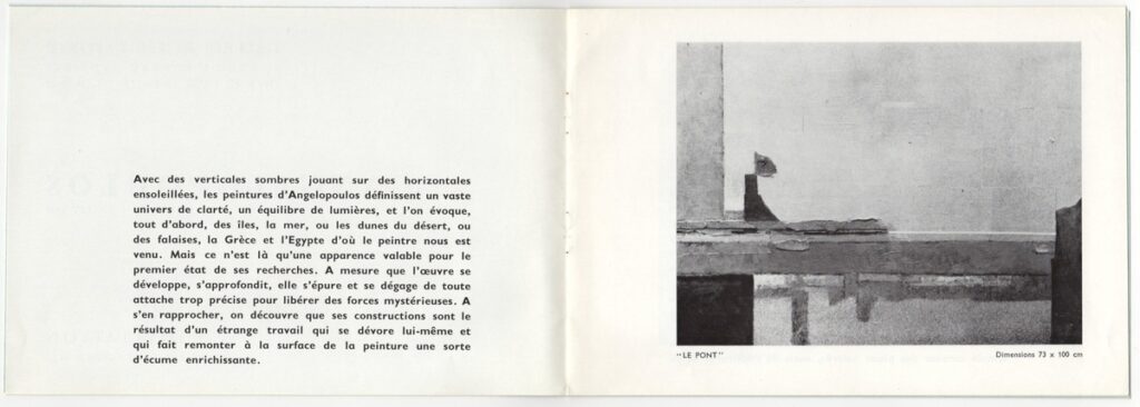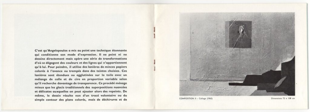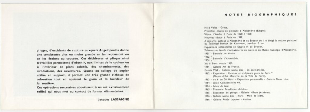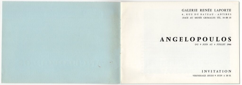 Έντυπο, ιλουστρασιόν χαρτί και χαρτόνι στο εξώφυλλο, 6 φφ., 14,5×21,0 εκ., στα γαλλικά. Πρόσκληση και κατάλογος έκθεσης της ατομικής έκθεσης έργων του Μένη Αγγελόπουλου στην Antibes το 1966. Περιέχει κείμενο του Jacques Lassaigne, αναπαραγωγή 2 έργων και σύντομο βιογραφικό του καλλιτέχνη.