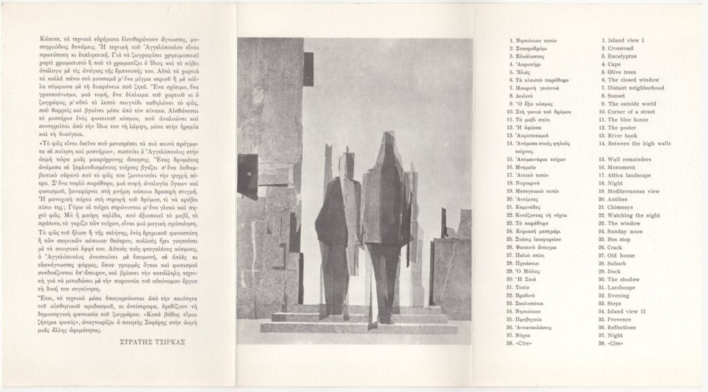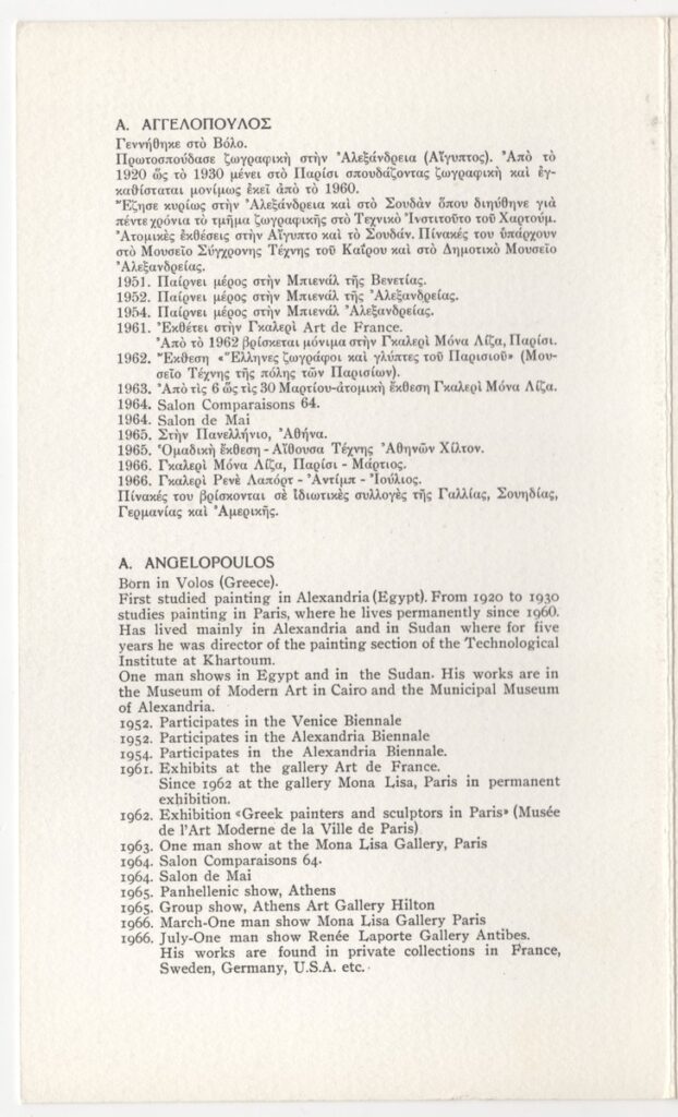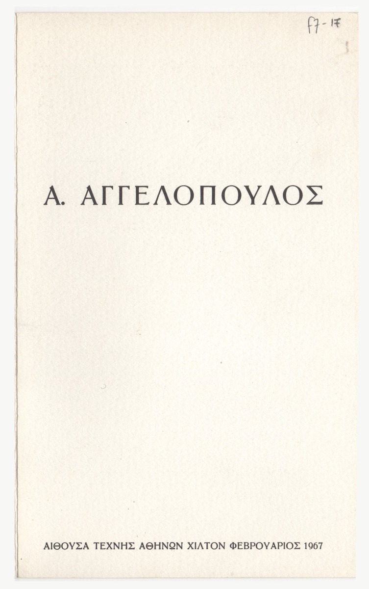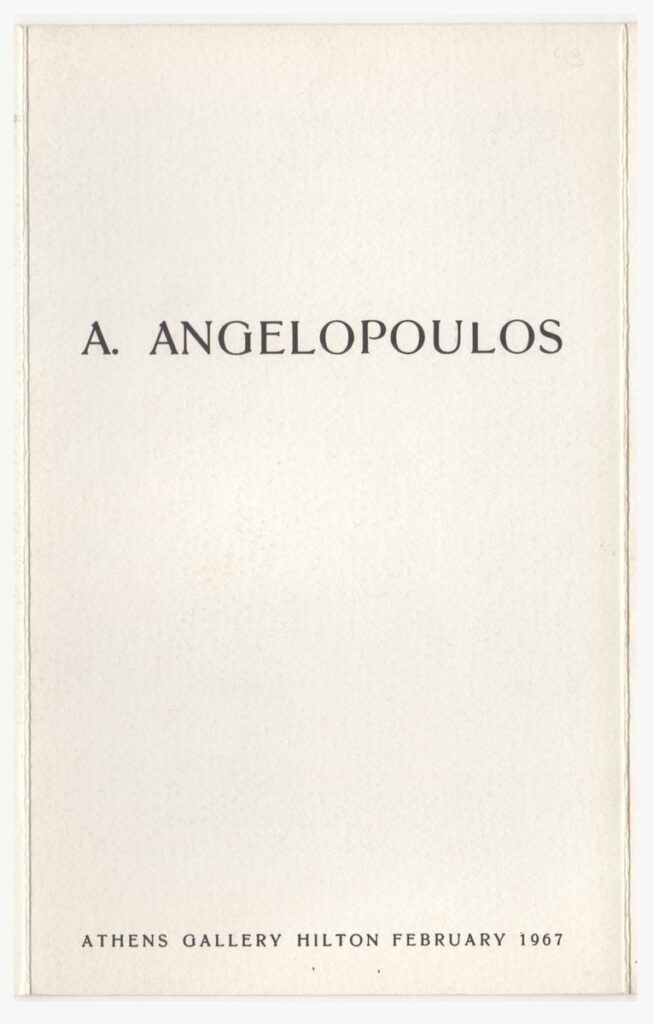 Έντυπο, τρίπτυχο, χαρτόνι, 22,0×13,3 εκ., στα ελληνικά και αγγλικά. Κατάλογος της ατομικής έκθεσης του Μένη Αγγελόπουλου στην Αθήνα το 1967. Περιέχει κείμενο του Στρ. Τσίρκα, κατάλογο έργων έκθεσης και σύντομο βιογραφικό καλλιτέχνη. Εσωτερικά, αναπαραγωγή έργου.