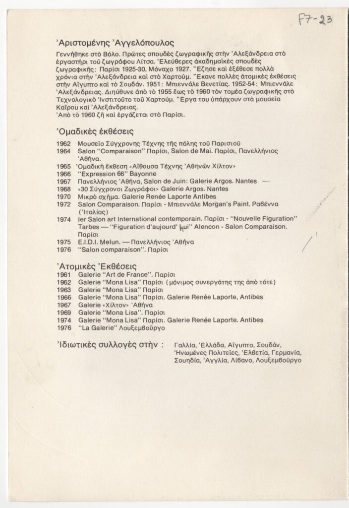 Έντυπο, δίπτυχο, σε χαρτόνι, 24,5×17,0 εκ., στα ελληνικά. Φυλλάδιο της ατομικής έκθεσης έργων του Μένη Αγγελόπουλου στην Αθήνα το 1976. Περιέχει κείμενο του Στρ. Τσίρκα, σύντομο βιογραφικό και κατάλογο εκθέσεων του καλλιτέχνη. Στο εξώφυλλο αναπαραγωγή έργου.