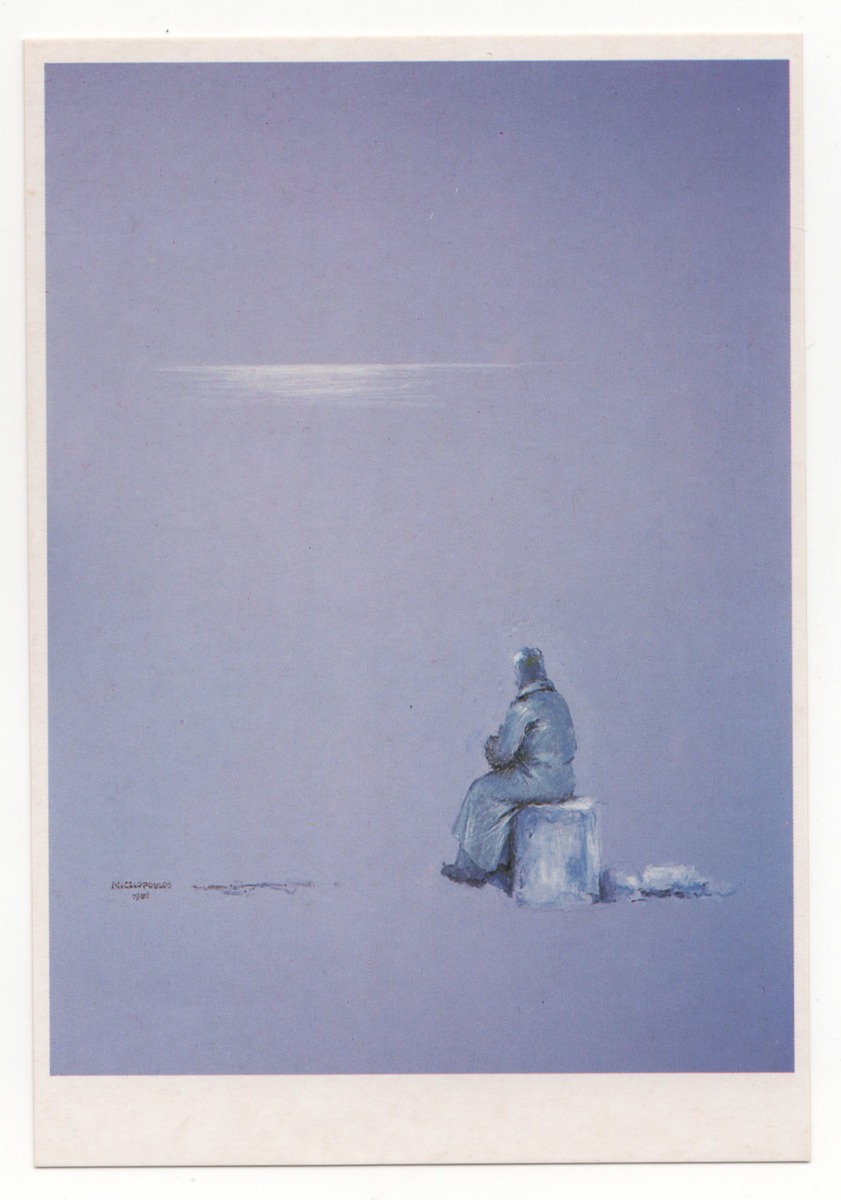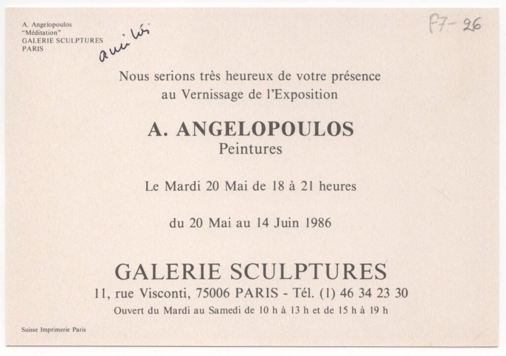 Έντυπο, μονόφυλλο, χαρτόνι, 10,4×15,0 εκ., στα γαλλικά, δύο όψεις. Πρόσκληση της ατομικής έκθεσης ζωγραφικής του Μένη Αγγελόπουλου στο Παρίσι το 1986. Στη μία όψη εικονογράφηση.
