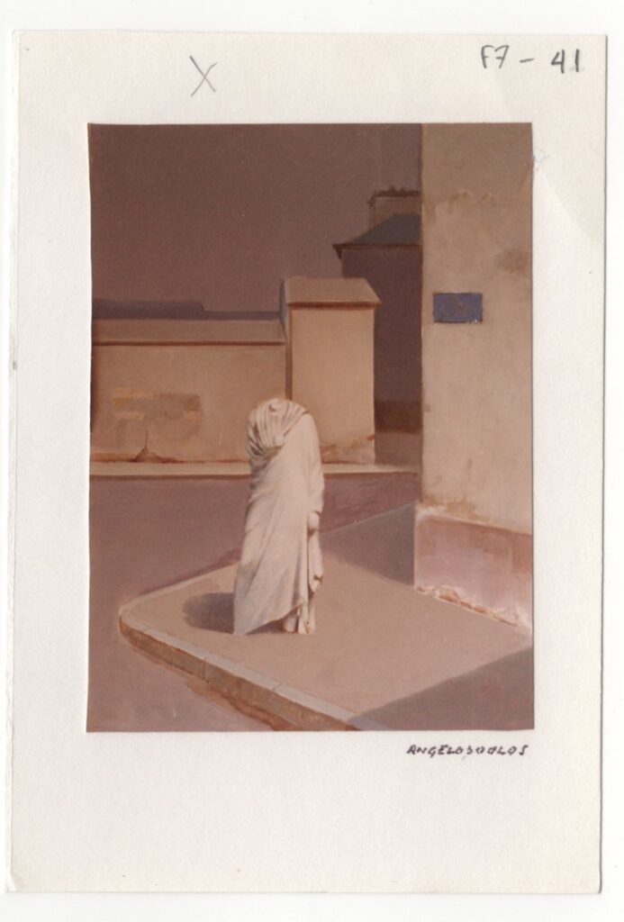 Φωτογραφία, έγχρωμη, σε φωτογραφικό χαρτί, 11,0×8,0 εκ., επικολλημένη σε χαρτόνι, 15,5×10,8 εκ., μία όψη. Αναπαραγωγή έργου του Μένη Αγγελόπουλου. Κάτω από την φωτογραφία, επιγραφή