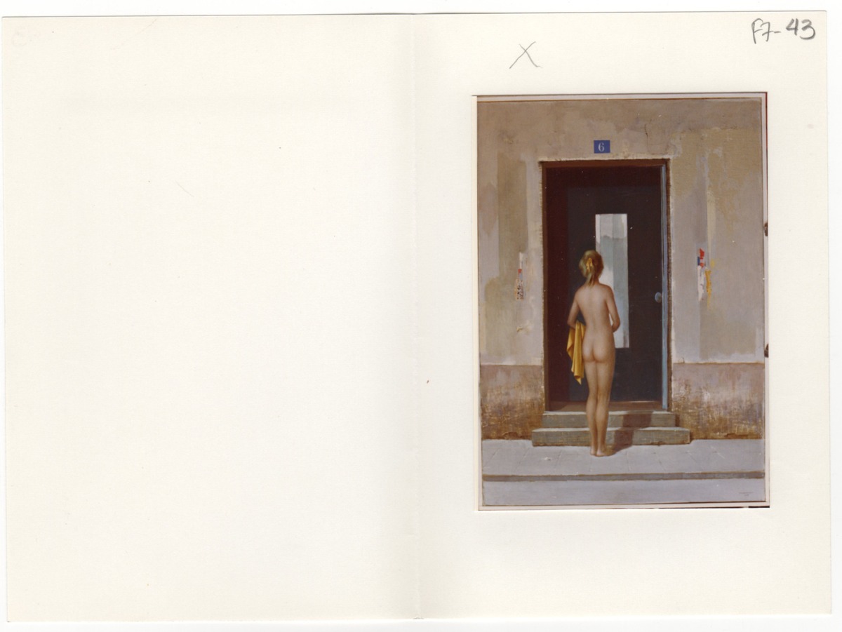 Φωτογραφία, έγχρωμη, σε φωτογραφικό χαρτί, 11,0×8,0 εκ., επικολλημένο σε χαρτόνι, δίπτυχο, 16,1×22,7 εκ. Αναπαραγωγή έργου του Μένη Αγγελόπουλου.
