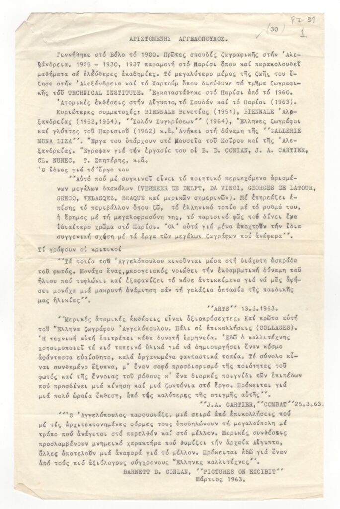 Βιογραφικό καλλιτέχνη και αποδελτίωση κειμένων για τον καλλιτέχνη από διάφορες πηγές: 1) Arts 13.03.1963, 2) J.A. Cartier, Combat 25.3.63, 3) Barnett D. Conlan, “Pictures on Excibit”, Μάρτιος 1963, 4) Εποχές, Μάρτιος 1965/no. 23.