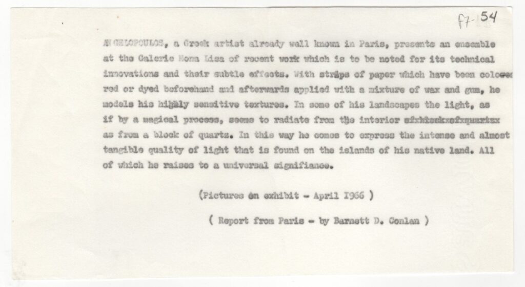 Κείμενο, δακτυλόγραφο, στα αγγλικά, σε χαρτί, 11,2×21,0 εκ., μία όψη. Αποδελτίωση κρτικής του Barnett D. Conlan για ατομική έκθεση του Μένη Αγγελόπουλου στο Παρίσι το 1966.
