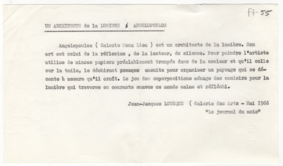 Κείμενο, στα γαλλικά, δακτυλόγραφο, σε χαρτί, 12,1×21,0 εκ., μία όψη. Αποδελτίωση κριτικής του Jean-Jacques Leveque για την ατομική έκθεση του Μένη Αγγελόπουλου στο Παρίσι το 1976.