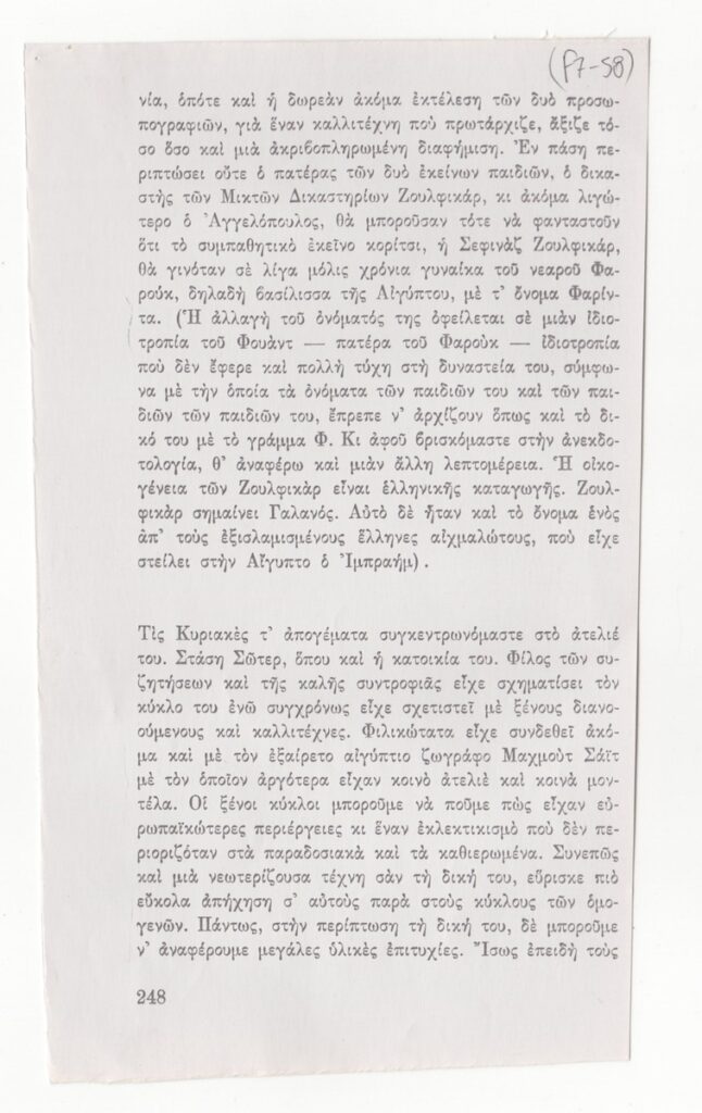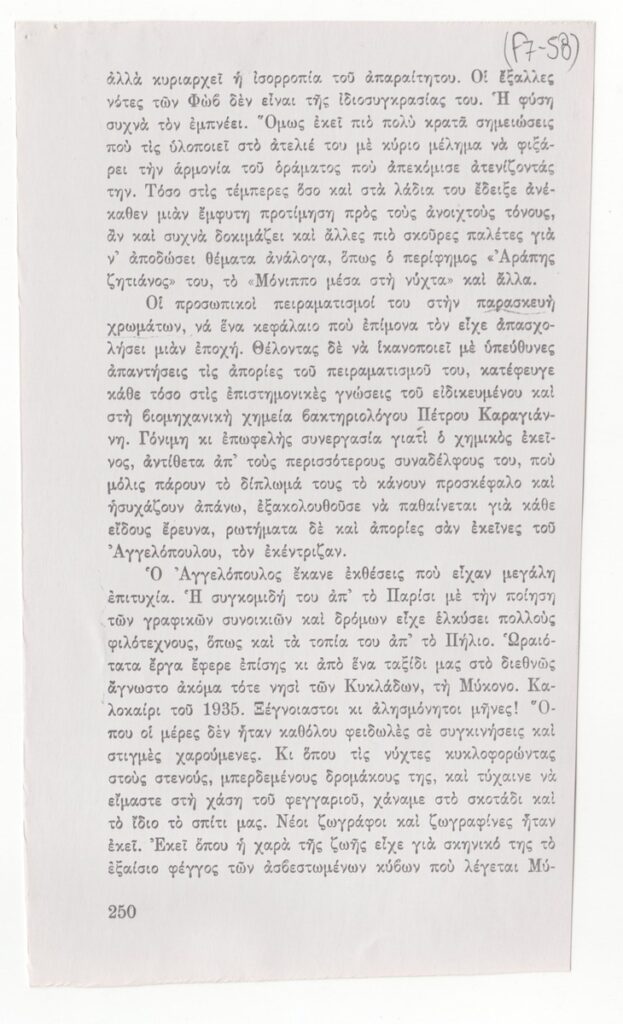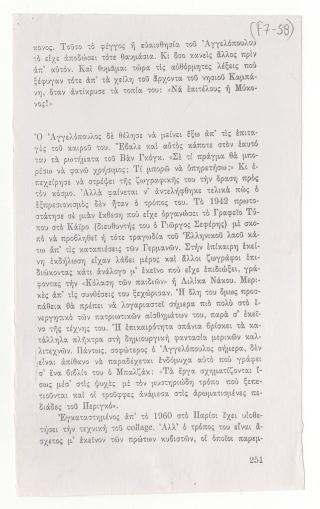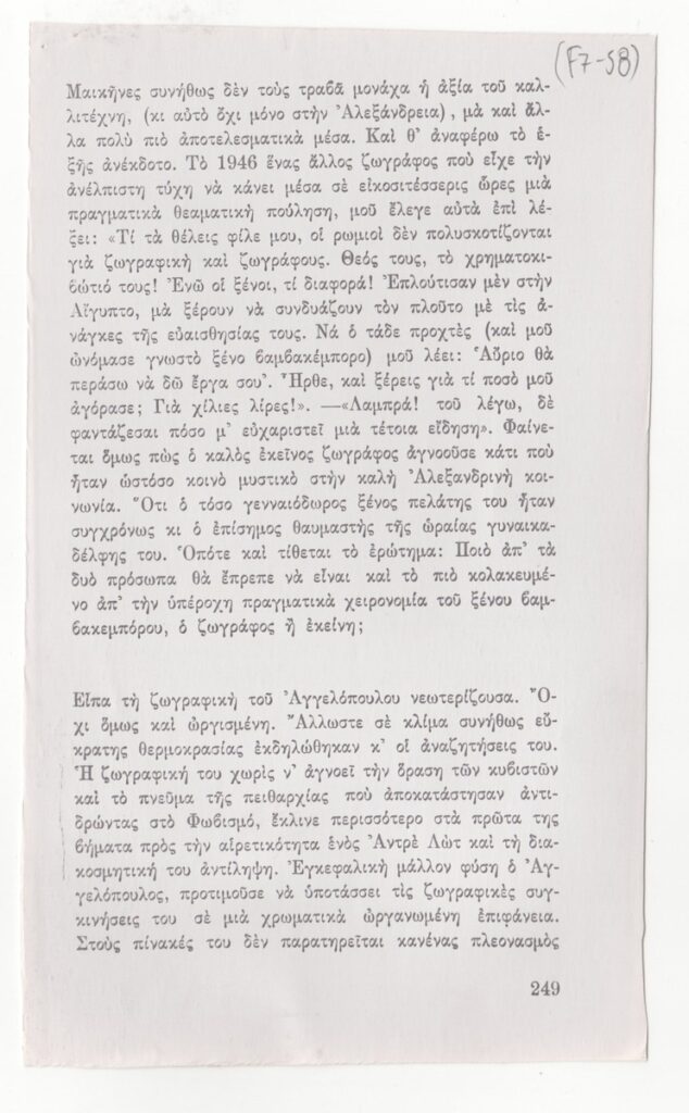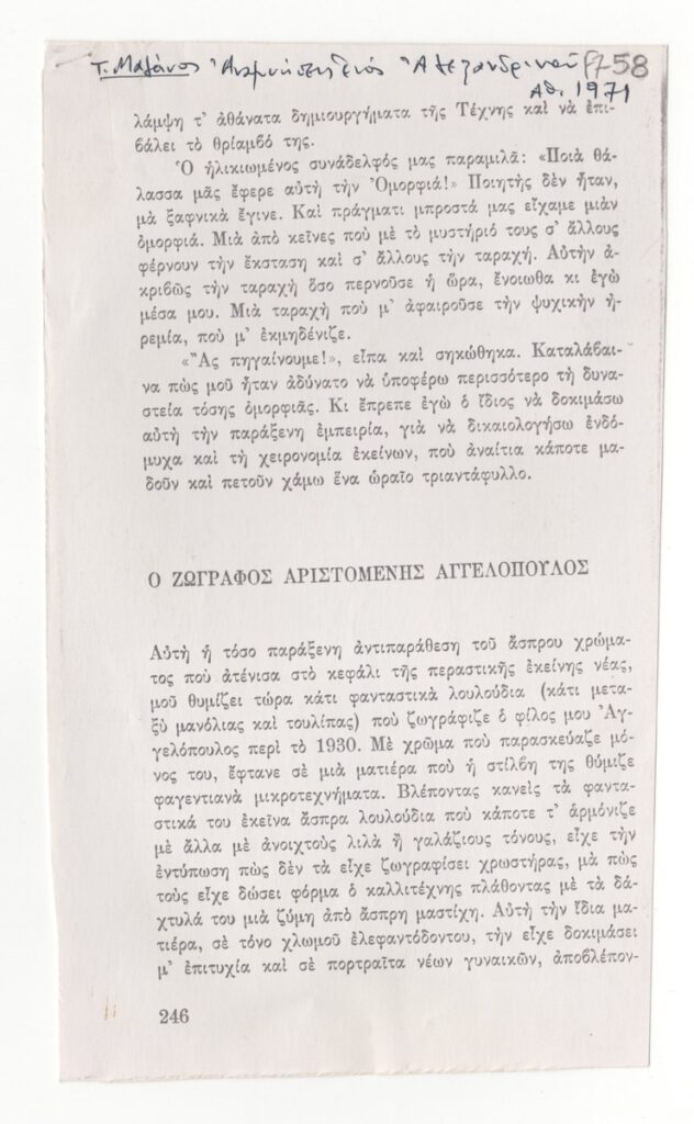 Φωτοαντίγραφο αποκομμάτων εντύπου, στα ελληνικά, χαρτί, 7 φφ, 19,5×11,7 εκ. Απόσπασμα του βιβλίου του Τ. Μαλάνου με τίτλο “Αναμνήσεις ενός Αλεξανδρινού”, που αναφέρεται στον ζωγράφο Μένη Αγγελόπουλο. Στην πρώτη σελίδα επιγραφή με τα στοιχεία της πηγής.
