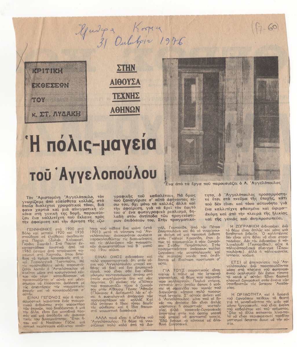 Απόκομμα, έντυπο, χαρτί, 23,5×20,5 εκ., όπου δημοσιεύεται, στα ελληνικά, άρθρο του Στέλιου Λυδάκη για την ατομική έκθεση έργων του Μένη Αγγελόπουλου στην Αθήνα το 1976. Εντάσσεται στη στήλη “Κριτική εκθέσεων”. Εικονογραφείται με αναπαραγωγή έργου. Επάνω επιγραφή με τα στοιχεία δημοσίευσης