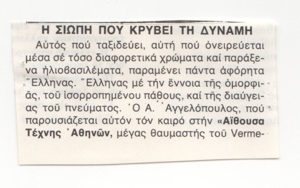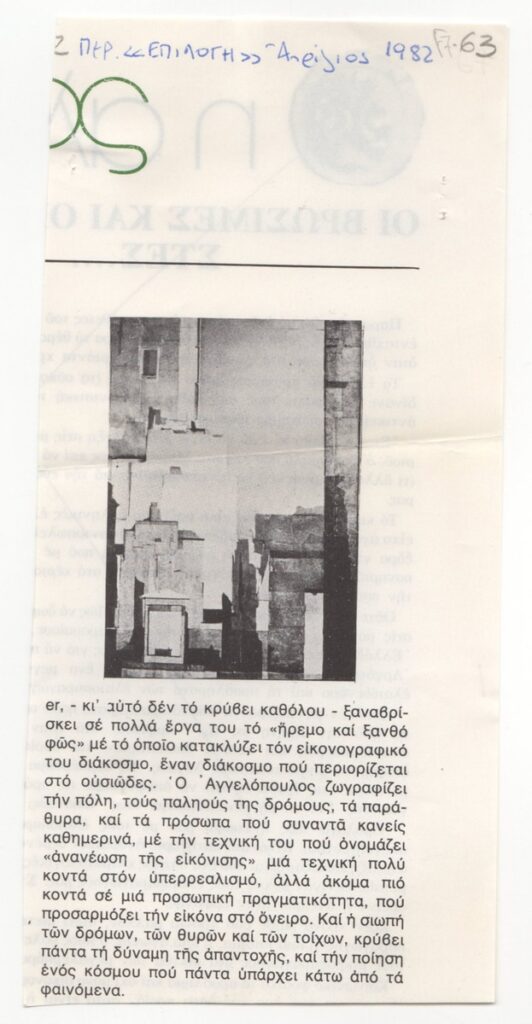 Αποκόμματα εντύπου, χαρτί, 2 τμήματα, 3,8×7,1 και 17,7×8,0 εκ., όπου δημοσιεύεται, στα ελληνικά, κριτική για την έκθεση έργων του Μένη Αγγελόπουλου στην Αίθουσα Τέχνης Αθηνών το 1982. Εικονογραφείται με αναπαραγωγή έργου. Στο δεύτερο απόκομμα επιγραφή.