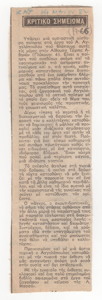 Απόκομμα, έντυπο, χαρτί, 15,5×5,5 εκ., όπου δημοσιεύεται, στα ελληνικά, κριτική για έκθεση έργων του καλλιτέχνη στην Αίθουσα Τέχνης Αθηνών το 1982. Επάνω επιγραφή με τα στοιχεία δημοσίευσης.