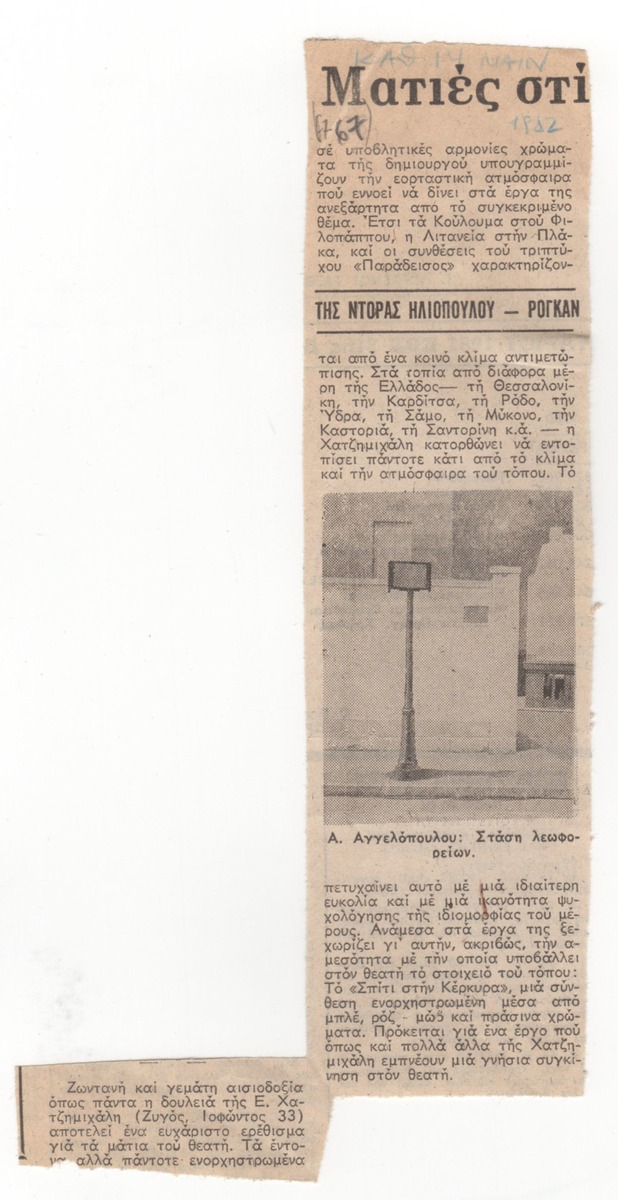 Απόκομμα, έντυπο, χαρτί, 19,2×5,2 εκ. (ακανόνιστο σχήμα), όπου δημοσιεύεται, στα ελληνικά, κριτική της Ντόρας Ηλιοπούλου-Ρογκάν για την ατομική έκθεση ζωγραφικής της Ε. Χατζημιχάλη στον Ζυγό. Εικονογραφείται με αναπαραγωγή έργου του Αριστομένη Αγγελόπουλου. Εντάσσεται στη στήλη “Ματιές στις εκθέσεις”. Επάνω επιγραφή με τα στοιχεία δημοσίευσης.