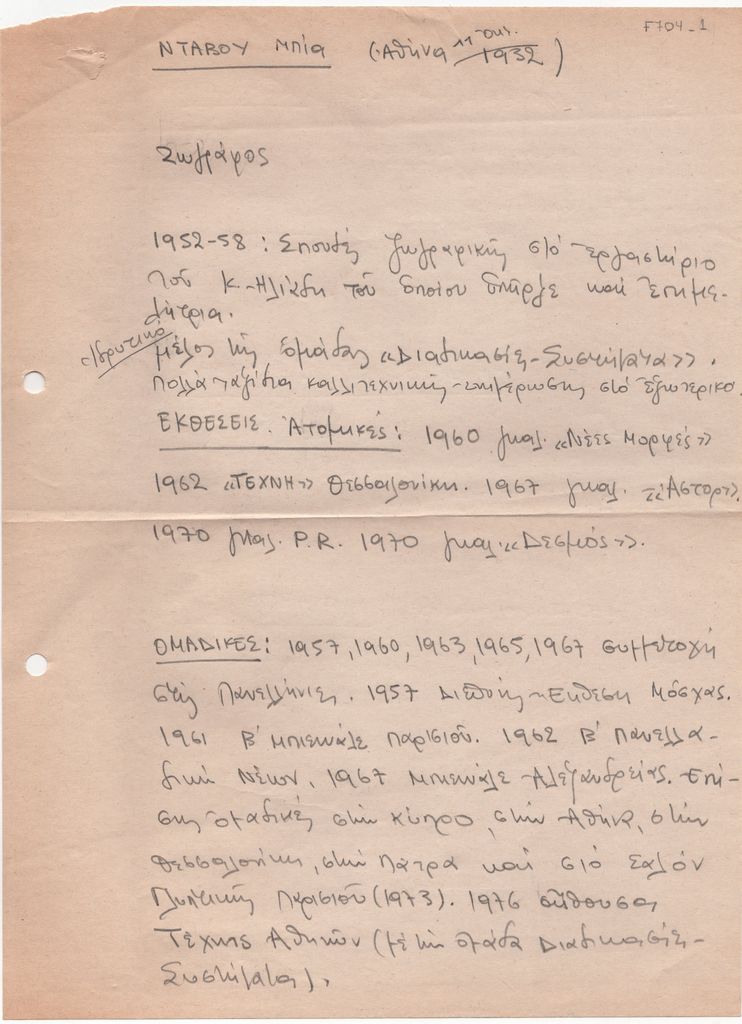 Κείμενο, χειρόγραφο, στα ελληνικά, σε χαρτί, 28,7×21,0 εκ., 2 φφ., μίας όψης. Βιογραφικό σημείωμα της ζωγράφου Μπίας Ντάβου. Αναφέρονται στοιχεία για τις σπουδές, τις ατομικές και ομαδικές εκθέσεις της και βιβλιογραφία.
