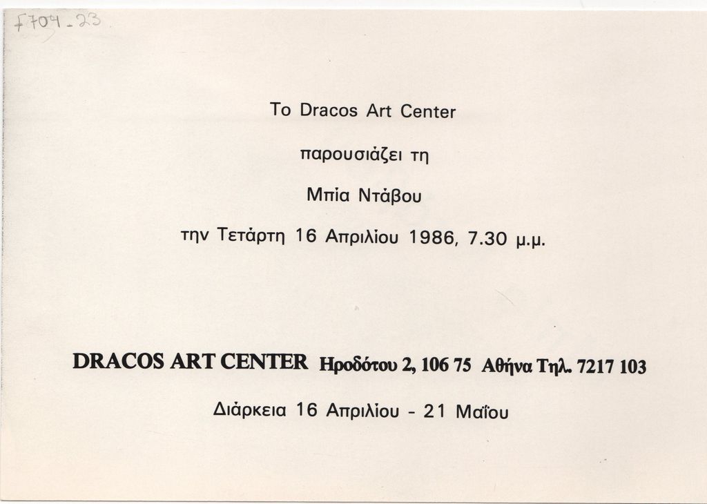 Έντυπο, στα ελληνικά, μονόφυλλο, χαρτόνι ιλουστρασιόν, 11,5×16,7 εκ. Πρόσκληση των εγκαινίων ατομικής έκθεσης έργων της Μπίας Ντάβου στην Αθήνα την άνοιξη του 1986. Στη μία όψη, εικονογράφηση.