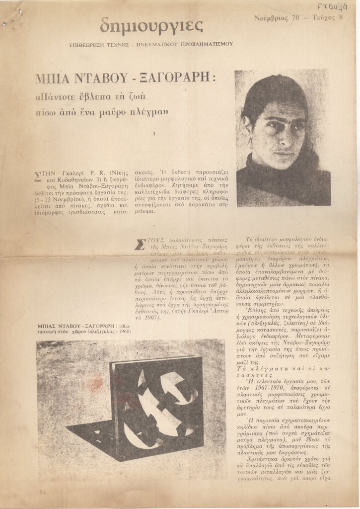 Φωτοαντίγραφο αποκόμματος, έντυπο, χαρτί, 29,6×20,8 εκ., 2 φφ., μίας όψης, όπου δημοσιεύεται στα ελληνικά, κείμενο της ζωγράφου Μπίας Ντάβου για το έργο της με αφορμή την ατομική έκθεση έργων της στην Αθήνα τον Νοέμβριο του 1970.