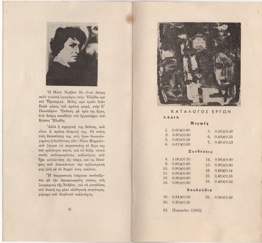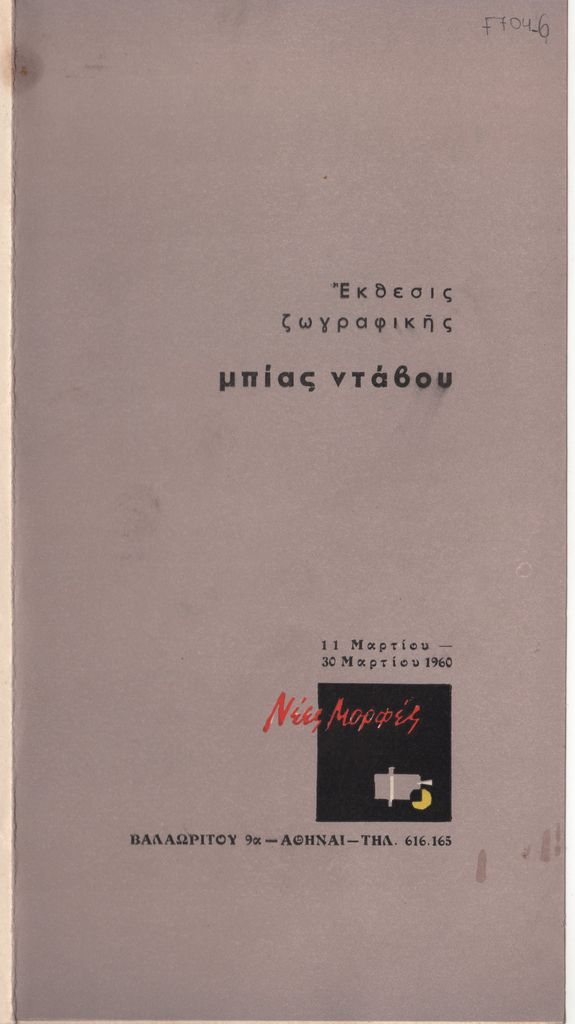 Έντυπο, στα ελληνικά, δίπτυχο, χαρτόνι, 23,0×12,5 εκ. Κατάλογος της ατομικής έκθεσης ζωγραφικής της Μπίας Ντάβου στην Αθήνα τον Μάρτιο του 1960. Περιέχει βιογραφικό της καλλιτέχνιδας και κατάλογο των έργων της έκθεσης.