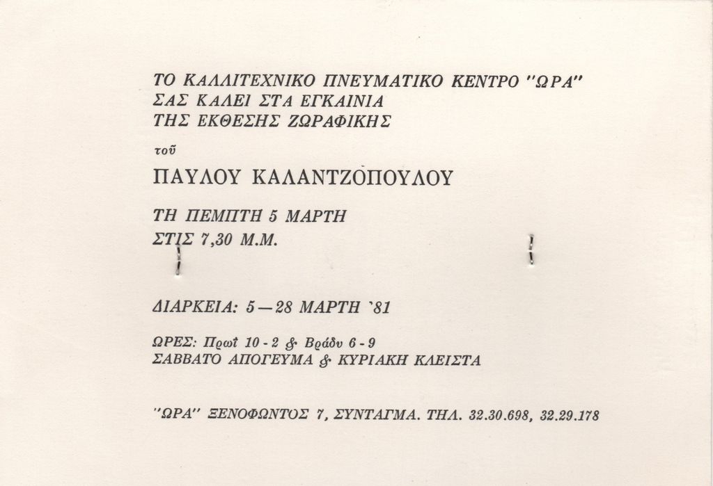Έντυπο, στα ελληνικά, μονόφυλλο, χαρτόνι, 11,0×16,0 εκ. Πρόσκληση των εγκαινίων της ατομικής έκθεσης ζωγραφικής του Παύλου Καλαντζόπουλου στην Αθήνα το 1981.