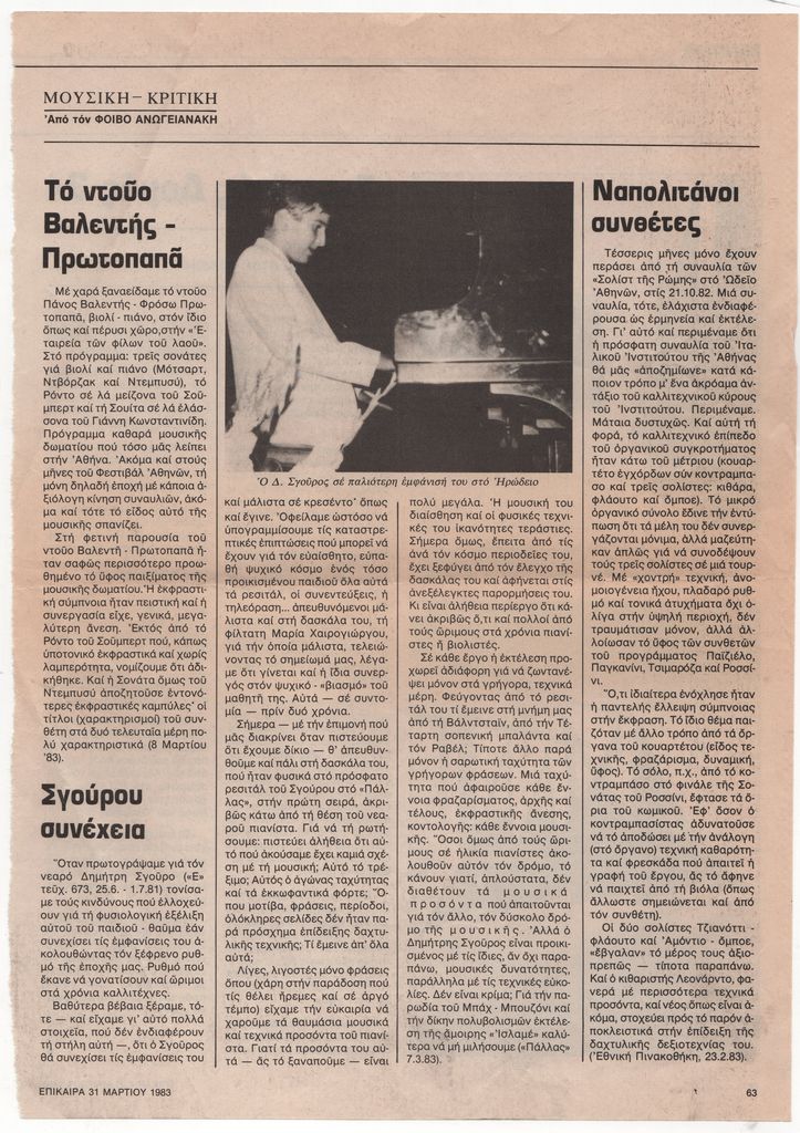 Απόκομμα, έντυπο, χαρτί, όπου δημοσιεύεται, στα ελληνικά, η στήλη του Φοίβου Ανωγειανάκη “Μουσική-Κριτική”. Περιλαμβάνονται οι κριτικές: “Το ντούο Βαλεντής-Πρωτοπαπά” για την συναυλία του Πάνου Βαλεντή και της Φρόσω Πρωτοπαπά, “Σγούρου συνέχεια” για τη συναυλία του Δημήτρη Σγούρου και τέλος “Ναπολιτάνοι συνθέτες” για την συναυλία του συνόλου “Σολίστ της Ρώμης” στην Αθήνα τον Μάρτιο του 1983. Στην άλλη όψη, κριτική για την ατομική έκθεση έργων της Μπίας Ντάβου στην Αίθουσα Τέχνης Δεσμός στην Αθήνα το 1983.