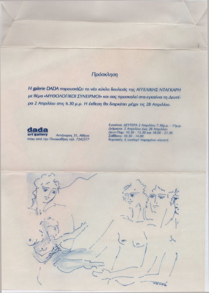 έντυπο, στα ελληνικά, ριζόχαρτο, διπλωμένο, 9,8×17,0 εκ. Πρόσκληση εγκαινίων της ατομικής έκθεσης έργων της Αγγελικής Ντάγκαρη με τίτλο «Μυθολογικοί συνειρμοί» στην Dada Art Gallery στην Αθήνα. Εσωτερικά, εικονογράφηση