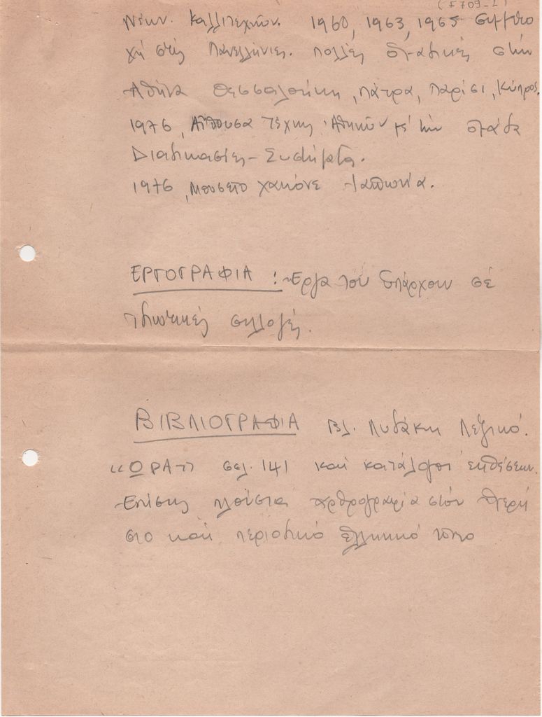 Κείμενο, χειρόγραφο, στα ελληνικά, χαρτί, 2 φφ., μίας όψης. 28,2×21,2 εκ. Βιογραφικό σημείωμα του Παντελή Ξαγοράρη. Αναφέρονται σπουδές, ατομικές και ομαδικές εκθέσεις, εργογραφία και βιβλιογραφία.