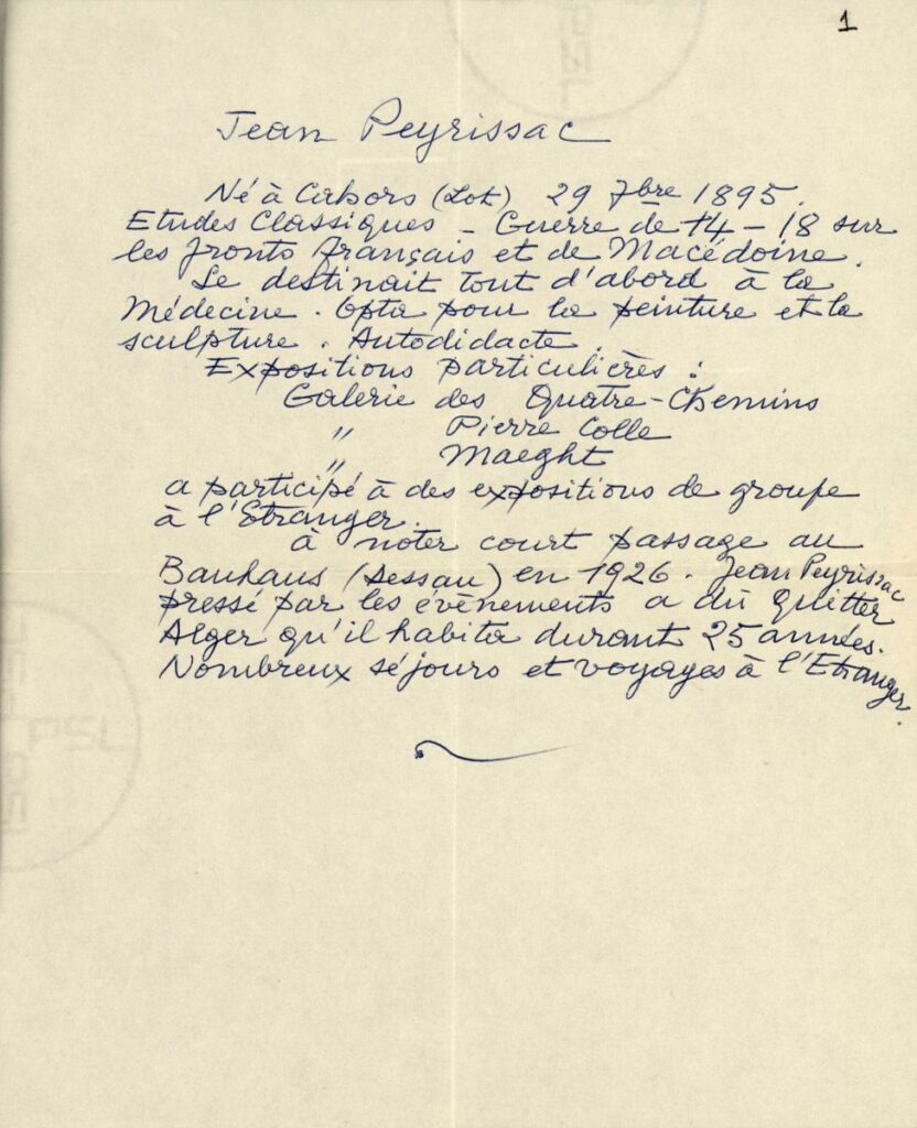 Κείμενο, χειρόγραφο, χαρτί, 21,5×17,5 εκ., στα γαλλικά. Βιογραφικό σημείωμα του Jean Peyrissac. Αναγράφονται σπουδές και εκθέσεις στις οποίες συμμετείχε ο καλλιτέχνης.