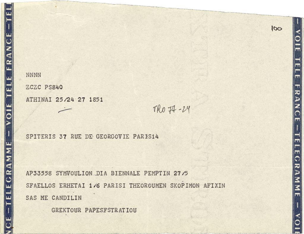Τηλεγράφημα, δακτυλόγραφο, χαρτί, 16×21 εκ., στα ελληνικά, απεσταλμένο από τον Δημήτρη Παπαευστρατίου, Γενικό Γραμματέα του ΕΟΤ, προς τον Τώνη Σπητέρη, αναφορικά με συνάντησή τους για την διοργάνωση της Μπιεννάλε Γλυπτικής (Παναθήναια) στην Αθήνα.