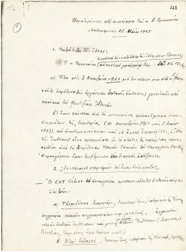 Πρόκειται για σημείωσεις/προσχέδιο του Τώνη Σπητέρη, απάντησης σε δημοσίευση του Άγγελου Προκοπίου στην Καθημερινή τον Μάιο 1965. Ο Σπητέρης αναγράφει τα ζητήματα που θίγει ο Προκοπίου στην κριτική του αναφορικά με τη διοργάνωση της Μπιεννάλε Γλυπτικής στην Αθήνα (Παναθήναια της Παγκόσμιας Γλυπτικής).