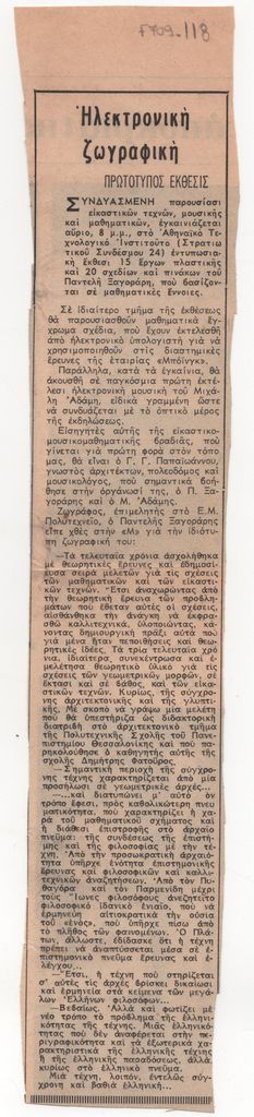 Απόκομμα, έντυπο, χαρτί, 29,0×5,7 εκ., όπου δημοσιεύεται, στα ελληνικά, κριτική για την ατομική έκθεση έργων του Παντελή Ξαγοράρη στο Αθηναϊκό Τεχνολογικό Ινστιτούτο. Περιέχει αποσπάσματα συνέντευξης του καλλιτέχνη.