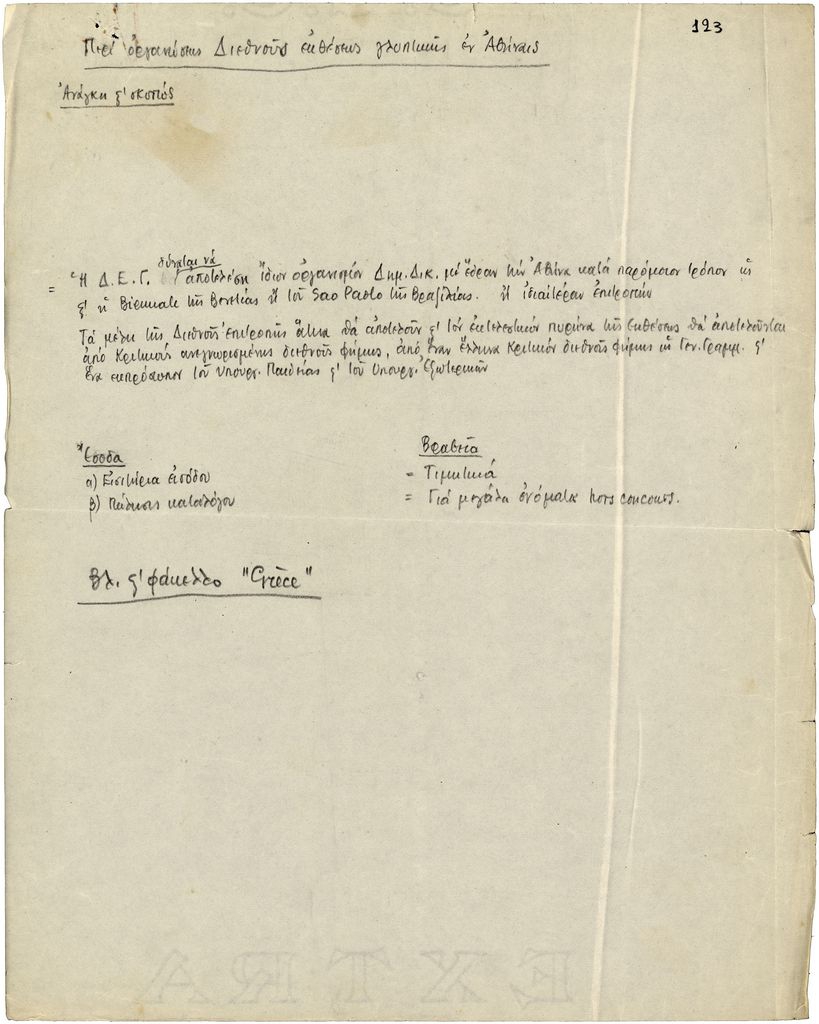 Κείμενο, χειρόγραφο, χαρτί, 29×21 εκ., στα ελληνικά, του Τώνη Σπητέρη, αναφορικά με τη διοργάνωση των Παναθηναίων της Παγκόσμιας Γλυπτικής.