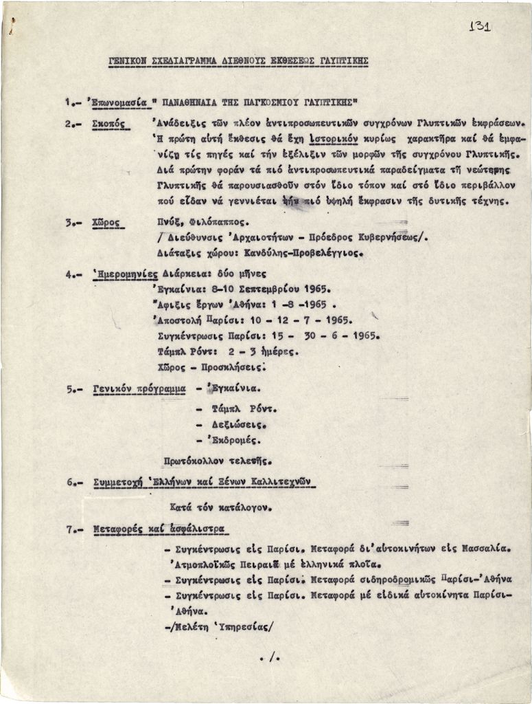 Δακτυλόγραφο κείμενο, χαρτί, 3 φφ, 29×21 εκ., στα ελληνικά, του Τώνη Σπητέρη. Πρόκειται για σχεδιάγραμμα διοργάνωσης των Παναθηναίων της Παγκόσμιας Γλυπτικής στην Αθήνα.